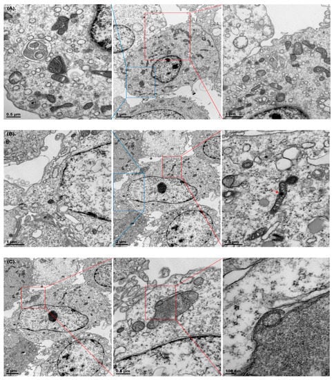 Overview of changes in intracellular structures of WCSC-treated cells. Astrocytes were incubated with 1% WCSC for 24 h, and TEM was used to observe changes in intracellular structures: (A) we can find autolysosome-like vacuoles (a blue square) and various sizes of mitochondria (a red square); (B) damage of the nuclear membrane (a blue square) and localization of WCSC components into the mitochondria (a red square, a red arrow); (C) mitophagy.