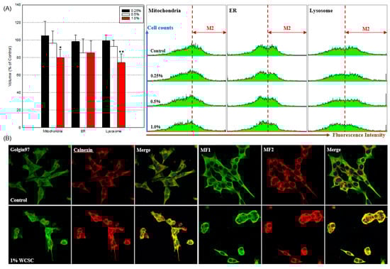 Considering the morphological changes observed under a phase-contrast microscope, we assessed changes in intracellular structures following exposure to WCSC using TEM. We found various sizes of mitochondria, autophagosome-like vacuoles, and impaired mitochondrial structures in WCSC-treated cells (Figure 3A, Supplementary Figure S1A–C). More interestingly, damage of the nuclear membrane (Figure 3B, Supplementary Figure S1D) and phagocytosis of an organelle by mitochondria (Figure 3C) were observed in cells exposed to 1% WCSC. Furthermore, the volumes of mitochondria (79.8 ± 9.7%), ER (85.5 ± 14.0%), and lysosome (74.3 ± 10.0%) tended to decrease in cells exposed to the maximum concentration of WCSC, compared with the control (Figure 4A). Furthermore, expressions of golgin97 (an indicator for the trans-Golgi), calnexin (a marker for ER), and MF1 and MF2 (essential proteins for maintenance of mitochondrial morphology) [] were concentrated near the nuclear (Figure 4B).