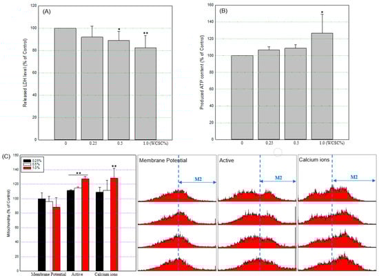 Cells initiate autophagic signals to maintain energy homeostasis, along with clearance of damaged organelles, and LDH catalyzes the reversible conversion of pyruvate to lactate in anaerobic conditions. In this study, the released LDH level decreased in a concentration-dependent manner, and the level was 91.9 ± 9.8%, 89.1 ± 8.1%, and 82.4 ± 10.9% of the control in cells exposed to 0.25%, 0.5%, or 1% WCSC, respectively (Figure 5A). While produced total ATP content (Figure 5B), active mitochondria (Figure 5C), and mitochondrial calcium ions (Figure 5C) tended to increase, compared to the control (126.5 ± 22.6%, 127.5 ± 3.3%, and 128.2 ± 13.6% of the control, respectively, at 1% WCSC), mitochondrial membrane potential (Δψ) tended to decrease with WCSC concentration (Figure 5C).