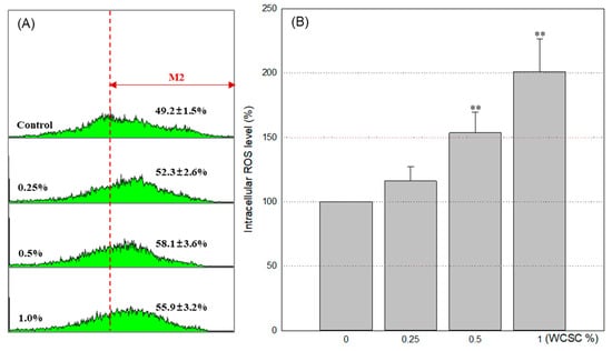 Intracellular ROS generation. Astrocytes were exposed to WCSC in designated concentrations for 24 h and then incubated with H2DCFDA for 1 h. Overall, 10,000 cells per sample were analyzed using a FACS system, and the levels were calculated as the relative value, compared to control (100%). Data show mean ± SD of independent three experiments. ** p < 0.01: (A) fluorescent intensity in each cell; (B) percentages of cells in M2 zone (cells that show increased ROS).