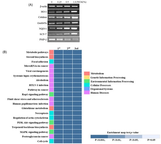 While the expression of genes associated with antioxidant responses (including HO-1, NQO-1, and catalase), energy metabolism (including SCF7, ATPase type 13, ATP-binding cassette, and aldehyde dehydrogenase family 3), and the immune response (including microRNA 29a, IL-11, TNF receptor, and layilin) was significantly enhanced by WCSC (1%) treatment (Table 2), expression of a gene encoding PMP2, a structural protein of peripheral nervous system myelin, was the most downregulated (Table 2). In addition, we confirmed concentration-dependent changes of some genes using the PCR analysis technique (Figure 7A). The KEGG pathway analyses also indicated that expressions of genes associated with metabolic pathways, steroid biosynthesis, and focal adhesion were the most clearly affected following exposure to WCSC (Figure 7B).