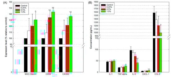Disturbance in immune cell chemotaxis. Astrocytes were incubated with WCSC (0, 0.25, 0.5, and 1.0%) for 24 h. All the end points were independently tested three times, and the results were presented as mean ± SD. * p < 0.05, ** p < 0.01; (A) expression of surface molecules. Overall, 10,000 cells per sample were analyzed using a FACS system, and the surface expression level of each protein was calculated as the relative value compared to the control (100%); (B) concentration of cytokines (or chemokines) in the cell supernatants. The concentration was determined using two wells per sample.
