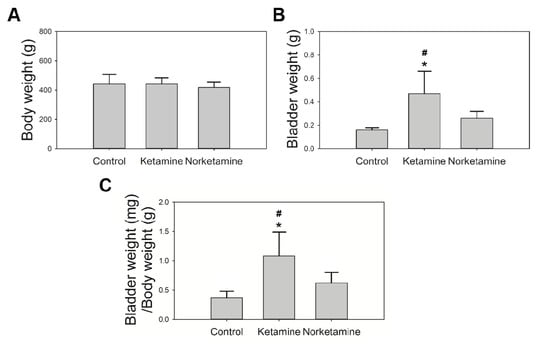 The body weight and bladder weight of rats in each group. The body weight (A) was recorded after administering the treatment for 4 weeks; the bladder weight (B) was recorded after euthanization; the bladder/body coefficient was calculated (C). * indicates statistical differences in comparison with the control group, p < 0.05; # indicates statistical differences in comparison with the norketamine group, p < 0.05.