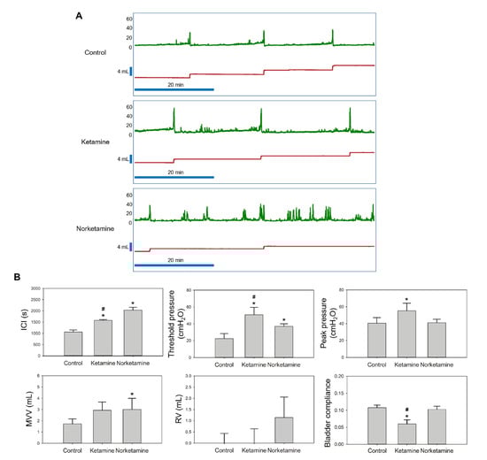 The cystometric analysis (CMG) of control, ketamine-treated, and norketamine-treated rats. (A) A one-hour period of CMG in each group observed with the recording software, Biopac Student Lab 4.1 (Biopac Systems Inc., Santa Barbara, CA, USA); (B) Statistical analysis of the intercontraction intervals (ICI), threshold pressure, peak pressure, residual urine volume (RV), mean voiding volume (MVV), and bladder compliance. * indicates statistical differences in comparison with the control group, p < 0.05; # indicates statistical differences in comparison with the norketamine group, p < 0.05.