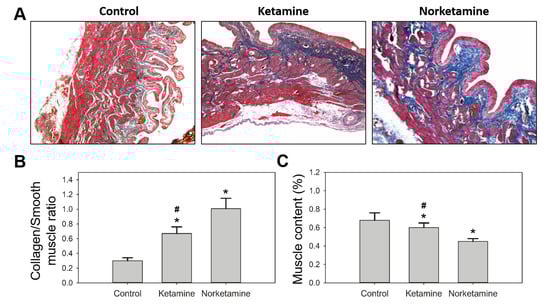 Masson’s trichrome staining of the bladder of the rats in each group (A), and the statistical analysis of collagen/smooth muscle (B) and smooth muscle content (%) of each group (C). * indicates statistical differences in comparison with the control group, p < 0.05; # indicates statistical differences in comparison with the norketamine group, p < 0.05.