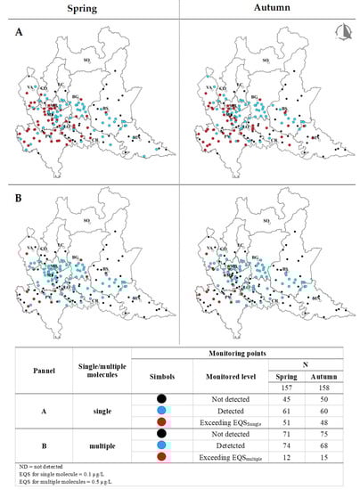 Maps of Lombardy, with the 12 provinces and their capitals (abbreviation). The monitoring points for groundwater are shown as dots. In panel (A,B): black dots = monitoring points where molecules were undetected. In panel (A): blue dots = points where at least one molecule was detected; red dots = points where one molecule exceeded the ESQsingle. In panel (B): blue dots = points where two or more molecules were detected; red dots = points where two or more molecules exceeded the ESQmultiple. Results for the spring and the autumn campaign are shown.