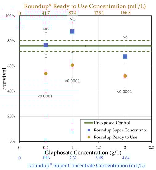 In the reproductive toxicity experiments, survival of flies decreased when exposed to Roundup® Ready to Use, which contains glyphosate and pelargonic acid but not POEA, consistent with studies showing an increase in Drosophila mortality after exposure to glyphosate [,,]. We expected to also see a decrease in survival of flies exposed to Roundup® Super Concentrate, which does contain POEA, especially since a recent study reported increased mortality in flies exposed to sub-lethal concentrations of both Roundup® Concentrate Plus and POEA alone []. However, Roundup® Super Concentrate did not affect survival at the lower concentrations and only slightly influenced survival at 2 g/L of glyphosate. These effects are small, as expected since we intentionally used concentrations below the LC50 for D. melanogaster [].