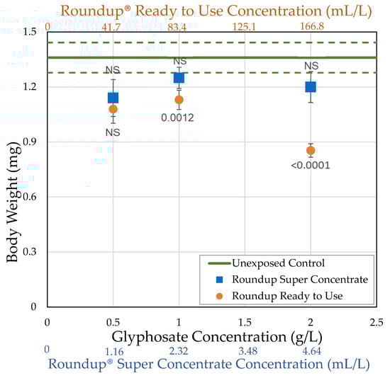 Although Roundup® Super Concentrate showed minimal effects on body weight relative to flies grown on the control medium, Roundup® Ready to Use did affect body weight, consistent with another study in Drosophila that also showed a dose dependent effect of Roundup® on the weight of flies []. While our study did not compare the weights of males to female flies, De Aguiar et al. [] also noted that a significant weight reduction was only observed in females, which could be explained by an effect on the gonads since the ovaries represent a significant mass compared to the total weight of the fly. Another explanation for the decrease in fly weights could be that glyphosate leads to a reduction in overall food consumption [].