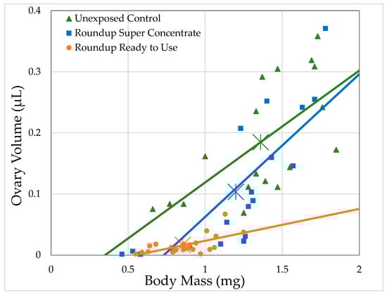 Relationship between ovary volume and body mass of D. melanogaster females exposed to herbicide in their food medium at the highest concentrations used (4.64 mL/L Roundup® Super Concentrate and 168.8 mL/L Roundup® Ready to Use; each corresponds to 2 g/L glyphosate) within 2 h of eclosion for 7 days, compared to the ovary volume of females exposed to the control medium.
