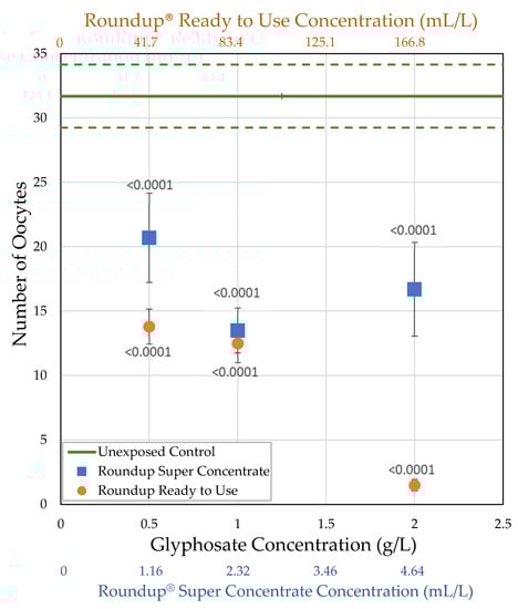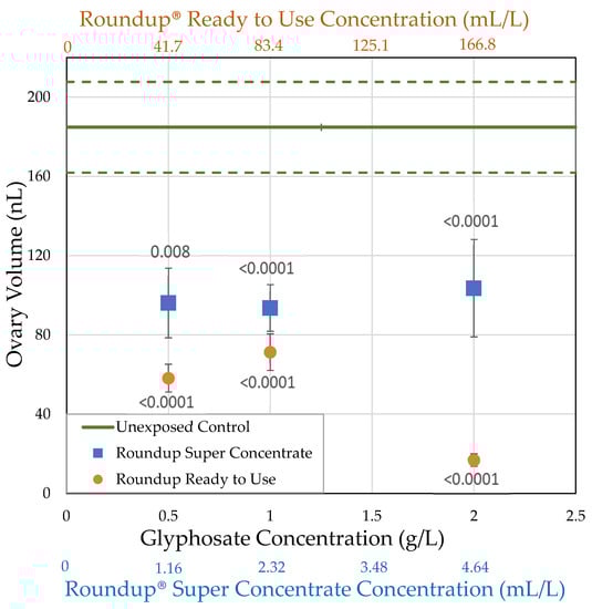 When considered together, the reproductive effects of ovary size and number of mature oocytes within the ovary differ between the two formulations, and by concentration of Roundup® Ready to Use but not Roundup® Super Concentrate, but no interaction between formulation and glyphosate concentration was observed. Within the same analysis, ovary volume and number of oocytes each followed the same pattern except that formulation and glyphosate concentration interacted to affect number of oocytes (MANOVA, Supplemental Table S6). Since ovary size and number of oocytes are strongly correlated with body size, we re-analyzed the results with one MANOVA to account for all three variables together (Supplemental Table S4b), and it did not substantively change the outcome.