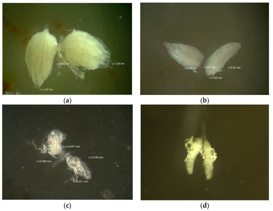After survival was scored, the males were discarded and each female was weighed intact prior to dissection. When flies were collected within 4 h of eclosion, 7–9 female flies were dissected for each treatment, including the control. For flies collected within 2 h of eclosion, we dissected a total of 18 flies for the control and dissected the following number of flies for herbicide treatments: 12, 20, and 20 for Roundup® Super Concentrate with POEA at 0.5, 1.0. and 2.0 g/L glyphosate, respectively; and 10, 21, and 24 flies respectively for Roundup® Ready to Use at 1.0, 2.0, and 4.0 g/L glyphosate plus pelargonic acid, respectively. Ovaries, oocytes, and spermatheca were dissected with micro forceps in Ringer’s solution under a dissecting microscope. The length and width of each ovary was measured using a stage micrometer, or using DinoCapture 2.0 Imaging Software, and the total number of mature oocytes in both ovaries or in the oviduct or uterus were counted. The volume V of each ovary was calculated using the formula for the volume of a prolate spheroid, as: