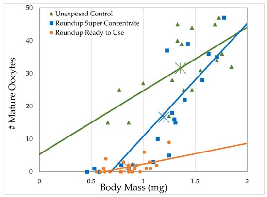 Relationship between the number of mature oocytes and body mass of D. melanogaster females exposed to herbicide at the highest concentrations used (4.64 mL/L Roundup® Super Concentrate and 168.8 mL/L Roundup® Ready to Use; each corresponds to 2 g/L glyphosate) within 2 h of eclosion for 7 days, compared to the ovary volume of females exposed to the control medium.