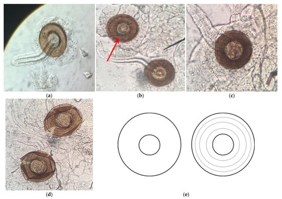 Spermatheca dissections at 400× magnification of D. melanogaster females exposed to (a) organic control medium within 4 h of eclosion, (b) Roundup® Ready to Use at 2 g/L of glyphosate within 4 h of eclosion, (c) Roundup® Ready to Use at 1 g/L of glyphosate within 2 h of eclosion, and (d) Roundup® Super Concentrate at 1 g/L of glyphosate within 2 h of eclosion. The red arrow in pane (b) indicates one toroidal mass of sperm, which can be seen in all spermatheca we dissected. (e) Female D. melanogaster spermatheca representations: virgin (left) and mated (right).