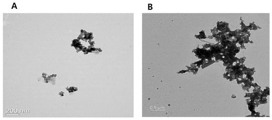 Transmission electron microscopy images of PM2.5 (A) and TSP (B). Length of bar at lower left section in each photo: (A) 200 nm and (B) 0.5 µm.