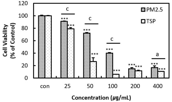 Cell viability measured by the water-soluble tetrazolium assay. Human lung epithelial cells (A549) were treated with PM2.5 and TSP at final concentrations of 0, 25, 50, 100, 200, and 400 µg/mL for 24 h. Experiments were repeated thrice. The values are reported as the mean ± SD (Student’s t-test, *** p < 0.001, vs. control; a p < 0.05, c p < 0.001).