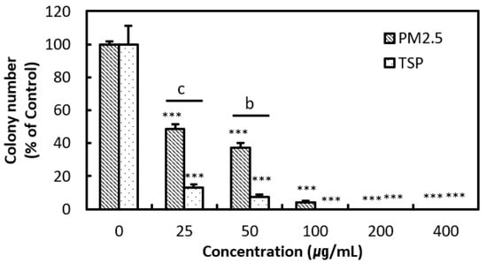The inhibition of cell colony formation induced by PM2.5 and TSP in human lung epithelial cells (A549). Cells were exposed to PM2.5 and TSP at concentrations of 0, 25, 50, 100, 200, and 400 µg/mL for 10 days. Experiments were repeated thrice. The values are reported as the mean ± SD (Student’s t-test, *** p < 0.001, vs. control; b p < 0.01, c p < 0.001).