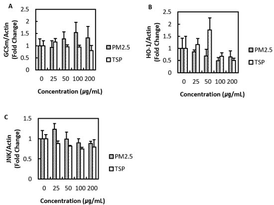 Effects of PM and TSP on the level of the glutamate-cysteine ligase modifier (GCSm), Heme oxygenase 1 (HO-1), and c-Jun N-terminal kinase (JNK). Protein expression of (A) GCSm, (B) HO-1, and (C) JNK were measured in A549 cells exposed to PM2.5 and TSP at 0, 25, 50, 100, and 200 µg/mL for 24 h.