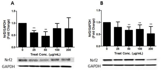 Activation of Nrf2 in cytosol of A549 cells after treatment with PM2.5 (A) and TSP (B). Cells were exposed to PM2.5 and TSP at 0, 25, 50, 100, and 200 µg/mL for 24 h. The values are reported as the mean ± SD (Student’s t-test, ** p < 0.01, vs. control).
