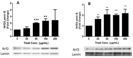 Activation of Nrf2 in nucleus of A549 cells after treatment with PM2.5 (A) and TSP (B). Cells were exposed to PM2.5 and TSP at 0, 25, 50, 100, and 200 µg/mL for 24 h. The values are reported as the mean ± SD (Student’s t-test, ** p < 0.01, *** p < 0.001, vs. control).