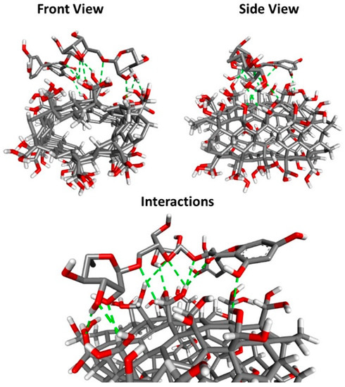 Carbon nanotubes can be covalently functionalized through concentrated acids that are capable of breaking the interactions between carbon atoms. This acid treatment alters the surface of the CNT, enabling the incorporation of charged groups [21]. Mostly used functionalization processes include oxidation through the immersion of the CNT in sulfuric acid and/or nitric acid, where the generation of bonds of carboxylic groups, hydroxyl groups, and sulfonic acids on the surface of the CNT occurs. The reaction conditions (ultrasound, temperature, and function) and oxidizing agents used for the surface functionalization of the CNT are determining factors for the formation of the necessary group bonds [21,22]. The outer surface of the CNT, when modified, can directly interact with biological organic molecules (DNA, RNA, and proteins), with other important exogenous molecules (drugs, polymers, and toxic agents) and even microorganisms and viruses [23,24,25,26,27]. In our work, we used acid ascorbic as an oxidant and H2O2 as an oxidizing agent. We used 0.1 g CNT, 18 mg ascorbic acid, 10 mL water, and 2 μL H2O2. Molecular docking was carried out to explore the binding mode between rutin and CNT. The docking pose with the lowest absolute value of affinity (kcal/mol) for CNT_RUT_HP_AA is depicted in Figure 1. The results of docking affinities, type of interaction, and geometry distance (Å) are shown in Table 1.