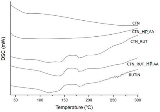 The DSC curves of rutin show three consecutive stages of mass loss, the first endothermic started at 56.05 °C and completed at 150.39 °C, attributed to a water loss, and the second started at 175.68 °C and finished at 191.85 °C, attributed to the melting of rutin (Table 2). A similar result was observed by [28]. However, these peaks were displaced and less perceived in the CNT_RUT and CNT_RUT_HP_AA curves.