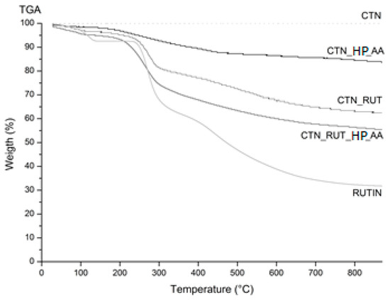 Mass loss obtained by thermogravimetric analysis of CNT, CNT_HP_AA, CNT_RUT, CNT_RUT_HP_AA, and RUTIN.