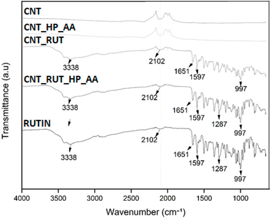 Fourier transform infrared spectroscopy spectra of CNT, CNT_HP_AA, CNT_RUT, CNT_RUT_HP_AA, and RUTIN.