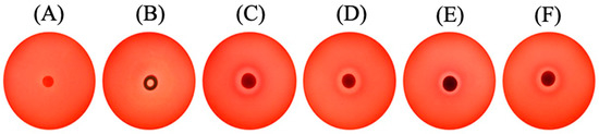 The cell line 3T3 (embryonic fibroblast) was used to evaluate via the agar disk diffusion methodology [20]. The visual analysis was performed and the clear halo of dead cells around the samples characterized the presence of a toxic material. The cells were plated in 60 mm Petri dishes, at a concentration of 1.5 × 105 cells/mL using DMEM High culture medium with 10% fetal bovine serum, they were allowed to grow for 48 h at 37 °C in a greenhouse 5% CO2. Then, the liquid medium was discarded, and the solid “overlay” medium (2× concentrated Eagle medium, containing 1.8% agar and 0.01% neutral red as a vital dye) was added to the cell mat. After solidification, the test material was deposited in the center of the plate and incubated for 24 h at 37 °C in an environment of 5% CO2. The readings of the inoculated plates were performed macroscopically, where cytotoxicity was verified by a clear halo around the toxic material corresponding to the dead cells, and microscopically through the morphological changes of the cells surrounding the sample.