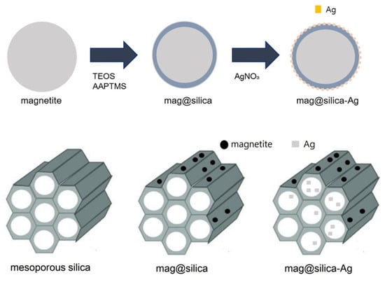 The silver-impregnated magnetite-silica (mag@silica-Ag) was synthesized as follows: firstly, the mag@silica (1 g) was stirred in 100 mL of silver nitrate (0.1 M) until the pH increased to above 9.5; the solution was stirred at 323 K for 20 h using a shaking incubator (250 rpm). The product was separated by centrifugation and washed three times with DI water. Finally, the resulting precipitate was dried in an oven at 333 K for 12 h. The overall procedure is depicted in Figure 1.