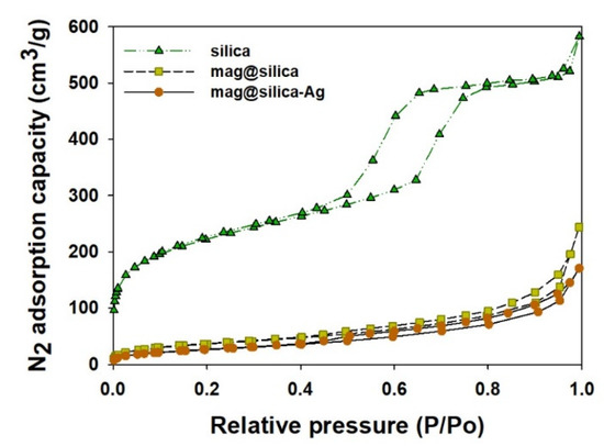 As listed in Table 2, silica has a larger surface area, pore size, and pore volume than mag@silica and mag@silica-Ag. The large surface area and the large pores are essential in increasing the adsorption capacity of the adsorbents. Although the surface areas of mag@silica and mag@silica-Ag decreased, their value is sufficiently large compared to any other adsorbents [3,22,27,28,31]. Because the pore volume of mag@silica-Ag was lower than the bare silica, it can be concluded that the silver was deposited inside the pores of the material [32].