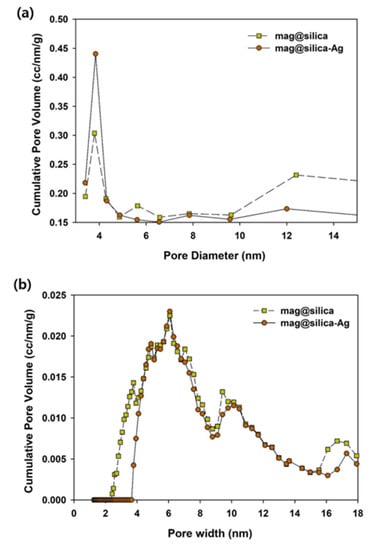 (a) Barrett–Joyner–Halenda (BJH) pore size distribution curves for the mag@silica and mag@silica-Ag, (b) the density functional theory (DFT) pore size distribution curves for the mag@silica and mag@silica-Ag.