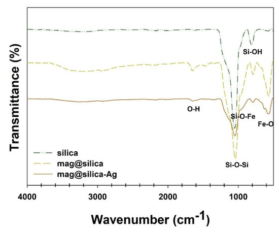 Figure 6 shows the FT-IR spectra of the silica, mag@silica, and mag@silica-Ag. For the silica, mag@silica, and mag@silica-Ag samples, the vibrational bands at ~567 cm−1 originate from the v (Fe-O) lattice vibrations. The mag@silica presents bands at 1049 cm−1, 815 cm−1, and 966 cm−1 corresponding to the stretching vibrations of v (Si-O-Si), v (Si-OH), and v (Si-O-Fe), respectively. The vibrational bands at ~580 cm−1 observed for mag@silica and mag@silica-Ag are due to the ν (Fe-O) lattice vibrations [22,33,34].