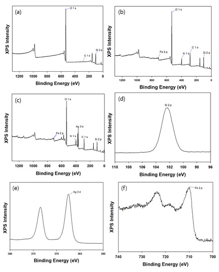 XPS was employed to confirm that each step of the synthesis was successful and to examine the chemical composition of the materials. Figure 8a,b present the XPS spectra of silica and mag@silica, respectively. The presence of the Fe 2p peak in the mag@silica spectrum demonstrates, once again, that magnetite is present in the material. Besides the peaks due to the presence of Si, O, and Fe, the XPS spectrum of the mag@silica-Ag composite presents the peak corresponding to Ag. The high C content observed in the mag@silica and mag@silica-Ag might be due to the precursors used to synthesize silica (CTAB (C19H42BrN), AAPTMS (C8H22N2O3Si), and TEOS (C8H2O4Si)).