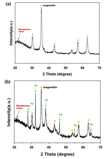 Figure 9 displays the XRD patterns of the mag@silica and mag@silica-Ag composites. Both spectra present a peak at 2θ = 21.8° corresponding to the mesoporous silica. The peaks due to synthetic magnetite were identified from JCPDS (ref. code: 01-088-0315, Fe3O4) and were present in both samples [22,33,36]. Besides the peaks due to silica and magnetite, the mag@silica-Ag presented peaks at 2θ = 38.4117°, 2θ = 44.278°, and 2θ = 64.427° due to silver, identified from JCPDS (ref. code: 00-044-0783, Ag) [37].