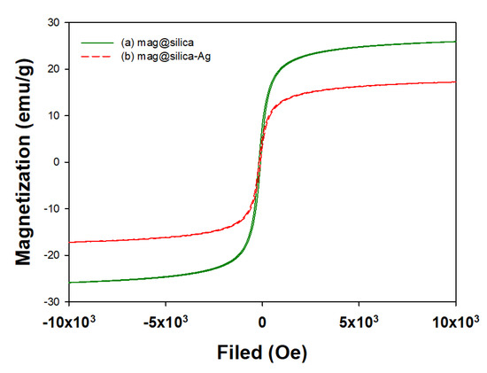 The field-dependent magnetization curves of the mag@silica and mag@silica-Ag composites are shown in Figure 10. The magnetic properties of Fe3O4 samples were measured on the VSM. As shown in Figure 10, the magnetic saturation value for the mag@silica is about 26 emu/g and it decreases to 17 emu/g after the addition of silver. The gradual loss of magnetization strength can be attributed to the shielding effect of the silver layer. However, this effect was not observed on the magnetic separability of the nanoparticles from the bulk solution [38,39]. The saturation magnetization of the thiol-functionalized magnetic sawdust is 7.28 emu/g [37] while the one for magnetic polyoxometalates-based adsorbent is 8.19 emu/g [40]. Compared with the existing magnetic adsorbent values, the magnetite saturation value of mag@silica-Ag is high enough to be used for magnetic separation.