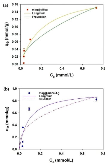 The Langmuir and Freundlich sorption isotherms are presented in Figure 11, and the isotherm parameters obtained by fitting the experimentally observed sorption equilibrium data to the isotherm models are listed in Table 4. The amount of I− adsorbed onto the synthetic sorbents increased with an increase in the initial I− concentration, which demonstrates that the concentration gradient is the driving force of the sorption [41]. To test if silica has any effect on the adsorption of I−, bare silica was also used in the experiments, but no sorption was detected. The Langmuir model using mag@silica and mag@silica-Ag provides an adequate fit (R2 > 0.83) to the experimental data for I− sorption onto the synthetic sorbents. The maximum sorption capacity (qm) of mag@silica-Ag was 0.82 mmol/g; this high adsorption is due to the presence of Ag. The good fitting of the experimental data to the Langmuir isotherm model, demonstrates that the I− was adsorbed homogeneously onto the surface of the mag@silica-Ag composite via a monolayer sorption and that the silver was uniformly distributed throughout the surface. Moreover, the primary adsorption mechanism was determined to be a physicochemical adsorption [42].