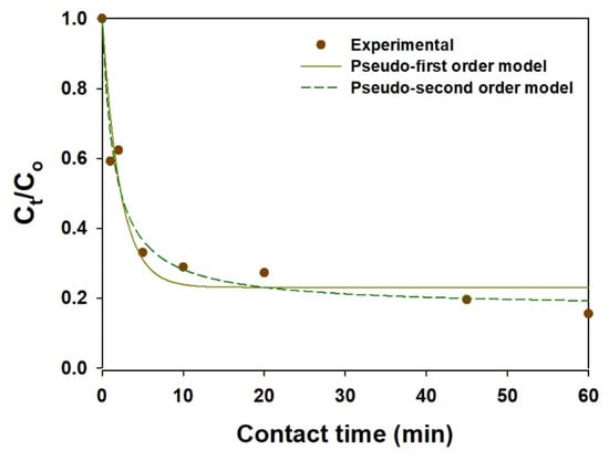 Two models were applied to analyze the kinetic data: a pseudo-first-order kinetic model (PFOKM) and a pseudo-second-order kinetic model (PSOKM) (Equations (5) and (6), respectively):