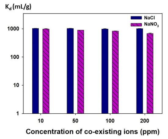 The I− uptake abilities of the mag@silica-Ag composite at different NaCl and NaNO3 concentrations expressed as distribution coefficient (Kd) are shown in Figure 14. The distribution coefficient (Kd) was determined using the following equation
