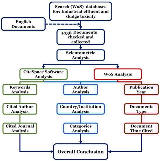 This study focuses on a scientometric analysis of industrial effluent and sludge toxicity to visualize and analyse the available documents in this regard. All studied documents have been obtained from the Web of Science (WoS) core collection platform (© 2020 Clarivate Analytics), which also covered most Institute for Scientific Information (ISI) publications from various core journals and is the universal database for ISI publications [19,20]. Hence, 1038 documents collected from WoS were analysed with CiteSpace program (Visualizing Patterns and Trends in Scientific Literature) and also WoS analysis (provided by (© 2020 Clarivate Analytics). The following keywords have been searched to assess all publications in this regard: * indust * or mill * or * factory * and effluent * or waste water * or wastewater * or waste * or sludge or landfill * or leachate * or release * or fate * or discharge or influent * and * toxic * or mutagen * or detoxif * or lethal. A fuzzy search has been applied with “*” and we did not apply any predefined specific duration of time to find out all publications. No limited duration was considered since the number of retrieved documents with the applied keywords was scarce. In this way, the utilized database was equipped with the opportunity to provide all the documents published at any time in the past. The performed research design is presented in Figure 1. There are four parameters for the scientometric analysis;