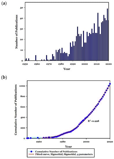 All obtained documents from 1951 to 2020 are shown in Figure 2, where the number of publications per year can be observed, and the cumulative publications number pattern. Table 1 represents the number of publications in the last decade, which includes more than 39% of all publications. The pattern of the cumulative number of publications with the fitted curve of sigmoidal four parameters (Rsqr = 0.9987) represents the sigmoidal growth of the number of publications over the adopted period.