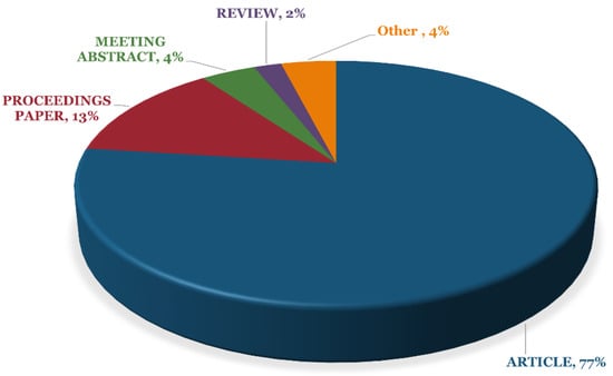 The results obtained from the search of the keywords mentioned above in WoS have been furthered analysed based on the type of published documents. Accordingly, the results indicate that most of the scientific documents in the field of toxicity analysis on industrial wastewater have been published as articles with an overall portion of 77%. Furthermore, proceeding papers (with a portion of 13%) and meeting abstracts (with the portion of 4%) were observed to include the highest types of published documents in this field (Figure 3).