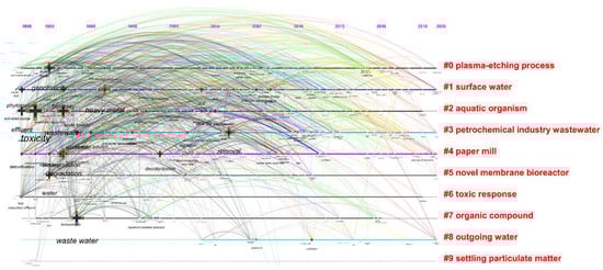 The keywords timeline illustrated in Figure 4 shows that between 1990 and 2000 a number of critical keywords on the toxicity of industrial effluent and sludge have appeared in the scientific documents. Keywords such as “toxicity”, “wastewater”, and “heavy metal” might have been used previously; however, they have been mainly highlighted and gained more attention in the period mentioned above. As represented in Figure 4, the clusters entitled as “plasma-etching process” (with a waste gas mixture of chlorinated hydrocarbons and inorganic by-products [33]), “pulp and paper mill” (with a high amount of sodium hydroxide, chlorinated organic compounds, low BOD, and high COD [34]), “olive oil mill” (with a high amount of high organic load, phytotoxic and antibacterial phenolic substance, [35]), and “petrochemical”(with polycyclic aromatic hydrocarbon [36]) in their discharges, are categorized as the most toxic industrial effluents for the receiving environments. Other industries, such as textile mills, normally produce highly concentrated toxic wastewaters laden with dyes, low BOD, and high COD [37]. The third biggest cluster represented as #2, entitled “aquatic organisms”, emphasizes the importance of the execution of toxicity evaluation testing via aquatic organisms, such as D. magna, which appeared in 1999. However, this test organism has not been presented in big fonts which demonstrates that this organism has not gained sufficient attention. Moreover, the fifth-largest cluster represented as #5 is called “novel membrane bioreactors”, which indicates that this technique of wastewater treatment has been applied the most. By a closer look at this cluster, the main keyword is “biodegradation”, represented with a big plus symbol, and which complies with the fouling problem of this treatment method and also it can be distinguished as a barrier [19]. Thus, more novel treatment techniques can be considered essential. The trend keywords represented in this figure via a plus symbol are “anaerobic digestion”, “phytotoxicity”, “degradation”, “metal”, and “olive oil”, respectively, listed from the most to the least important. The main top four trends appeared before 2000 and only the least significant trend, “olive oil”, appeared in 2005. After 2005, no significant trend keyword has been observed. Moreover, as shown in this figure, after 2010, only a few keywords have been entered in the scientific literature in this field. This may demonstrate that there is still a lack of in-depth studies, including keywords such as “nanotoxicology” as an emerging global issue caused by the application of nanomaterials for wastewater treatment [38].