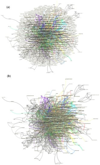 The analysis regarding the appeared keywords in the scientific documents published on the industrial effluent and sludge toxicity analysis from 1950 to 2020 via CiteSpace software. Figure (a) represents the keywords’ analysis without the centrality for better visualization, and (b) demonstrates the same figure with the respective centrality.
