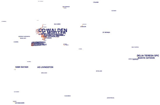 The obtained documents from the search of the keywords mentioned above in WoS were furthered inserted in CiteSpace software to be analysed regarding the authors who contributed to the field of toxicity analysis of industrial effluents. Figure 6 and Table 3 represent the results achieved from this analysis. As it can be observed, the authors “Walden. CC” (frequency = 16 and burst = 9.25), “Mueller. JC” (frequency = 13 and burst = 7.5), and “Nestmann. ER” (frequency = 9 and burst = 5.17) have contributed the most in this field. In this analysis, the nodes represent the authors, while the links demonstrate the contribution among authors. As shown in Figure 6, no significant connections have been formed among the authors who are accounted to be contributing to the field of toxicity analysis on the industrial wastewaters except very few groups.