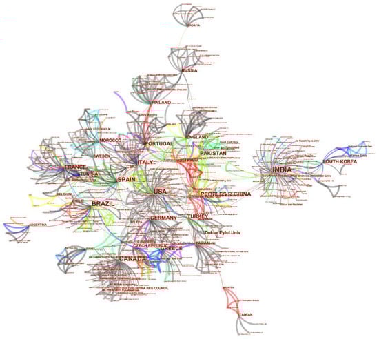 According to Figure 6, there are just a few collaborating authors in the field of toxicity assessment of industrial effluents. As can be observed, no extensive collaboration links have been formed, even between some of the most active authors in this field, such as Walden.CC, Mueller.JC, and Douglas.GR (represented with the biggest font as their contribution has been more). Although some collaborations between some countries and institutes can be identified from this figure, due to their cooperation on international projects, a low degree of collaborations is observed among the individual researchers. Figure 7 and Figure 8 represent the share of the countries and institutes in this field. As can be observed, India is the most active country in publishing bibliographic records on industrial wastewater’s toxicity. Besides the government’s strict regulations, the amount of effluents produced in India and subsequent environmental drawbacks can be the most important reasons for India’s position in this regard [39]. The USA, Canada, Brazil, and Spain are the most active countries in this field after India. Also, China, which is accounted as one of the most industrialized countries with high contributions in the scientific document production in the field of wastewater treatment (e.g., in applying MBR bioreactor [19]), has no significant contribution in the field of the industrial wastewater toxicity. The progress in scientific research in this field needs pressure from stakeholders, customers, and communities [40] rather than the degree of the country’s development. As stated before, the most active country in this field is India, which, as a developing country, possesses highly toxic industries.