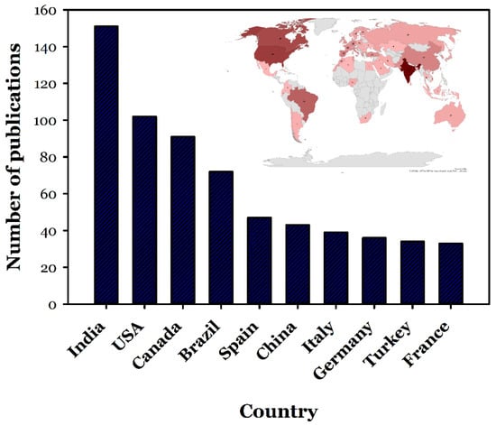 Countries that most contribute to the field of the industrial effluent and sludge toxicity analysis with their respective number of published documents over the adopted duration from 1951 to 2020. The most contributing countries in this field have been presented with a darker color in the map, and the variation in the utilized color demonstrates the number of contributions provided by different countries.