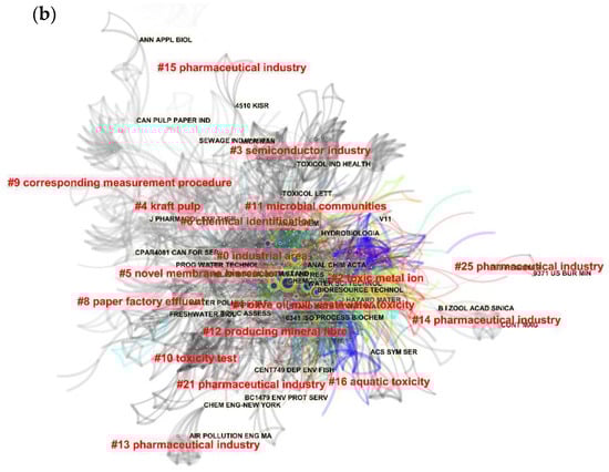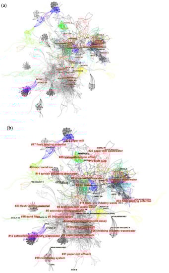 The obtained results from the analysis of the cited authors and organizations contributing to the field of industrial effluent and sludge toxicity from 1951 to 2020. Both illustrations (a,b) have been achieved via the utilization of CiteSpace software. Figure (a) represents the cited authors in this field, while figure (b) illustrates the clustering applied to the most cited authors.