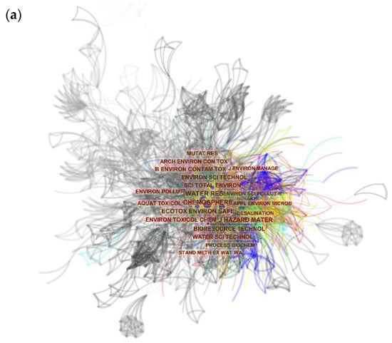 The obtained scientific documents on the industrial effluent and sludge toxicity analysis from 1951 to 2020 were further examined based on the most cited journals. Figure 10 and Table 6 demonstrate the obtained results in this regard via the utilization of CiteSpace software. Based on the achieved results, the journals “Chemosphere” (frequency = 409 and burst = 0.55), “Water Research” (frequency = 406 and burst = 5.89), “Ecotoxicology and Environmental Safety” (frequency = 274 and burst = 2.41) and “Journal of hazardous material” (frequency = 264 and burst = 10.82) were identified to be the journals with the highest received citations. Moreover, as can be observed from Figure 10b, the keywords clustering based on this analysis demonstrates 25 clusters with “industrial area” as the largest cluster (#0) with 208 members.