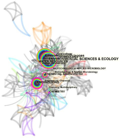 The obtained documents from the search of the keywords mentioned above in the industrial effluent and sludge toxicity from 1951 to 2020 were furthered analysed based on the categories they were divided into. This analysis has been performed via the utilization of CiteSpace software, and the respective result is presented in Figure 11 and Table 7. As can be observed, most of the considered documents were in the field of “environmental sciences & ecology” with a record count of 584. The second and third categories with the highest number of record counts were observed to be “Environmental Sciences” and “Engineering” with the respective record counts of 577 and 296, respectively.