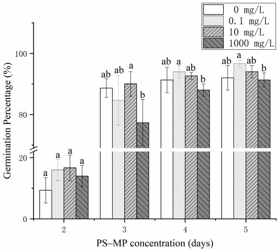 Effects of different polystyrene microplastics (PS-MP) concentrations on rice seed germination. Note: Data are expressed as mean ± standard error (SE). Lowercase letters indicate significant differences between the germination rates of rice seeds treated with different PS-MP concentrations over the same incubation period (p < 0.05), ab represents no significant change from a and b respectively. No rice seeds germinated on the first day. The germination rate of the rice seeds in each treatment stabilized on the fifth day. Germination percentage = (number of seeds germinated on the day/number of test seeds) × 100%.